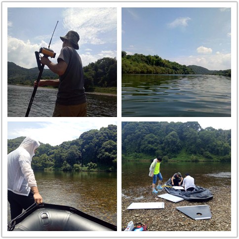 此次項(xiàng)目區(qū)河段較寬,因此測量人員需采用皮艇劃至河流中心進(jìn)行實(shí)測。為保證測量的真實(shí)性、明確性,我院測量人員一直以來都堅(jiān)持詳細(xì)測量每個(gè)項(xiàng)目所在的地形地貌,不畏艱險(xiǎn)。測量信息的準(zhǔn)確和真實(shí)也能為后期的設(shè)計(jì)階段提供明確、詳盡的基礎(chǔ)資料。